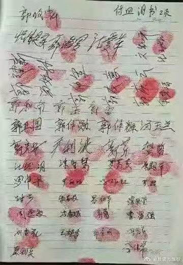 下面是受害人郭建德反映情况材料和上百村民作证签名